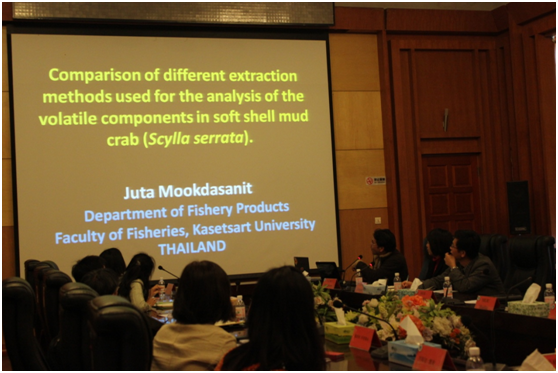 研讨会由牟海津副院长主持。首先,薛长湖院长介绍了我院的教学与科研情况,Suriyan Tunkijjanukij 院长介绍了泰国来访的教师和农业部官员。随后,泰国农业部水产部门官员Supakant Chaichotranunt先生作了题为:“泰国糙海参的养殖与繁育”的报告,贵妃直播 唐庆娟副教授作了题为:“海参活性成分与加工技术”的报告,泰国农业大学水产学院教师Juta Mookdasanit 博士作了题为:“不同提取方法对锯缘青蟹挥发性成分检测的影响比较”的报告。此次“中-泰”国际合作项目研讨会主要围绕海参的养殖及加工技术展开,整场研讨会气氛高涨,参会人员讨论热烈,食品学院师生均表示受益良多。此次研讨会为双方进一步深入交流与合作夯实了基础。(文/唐庆娟;图/武娟)