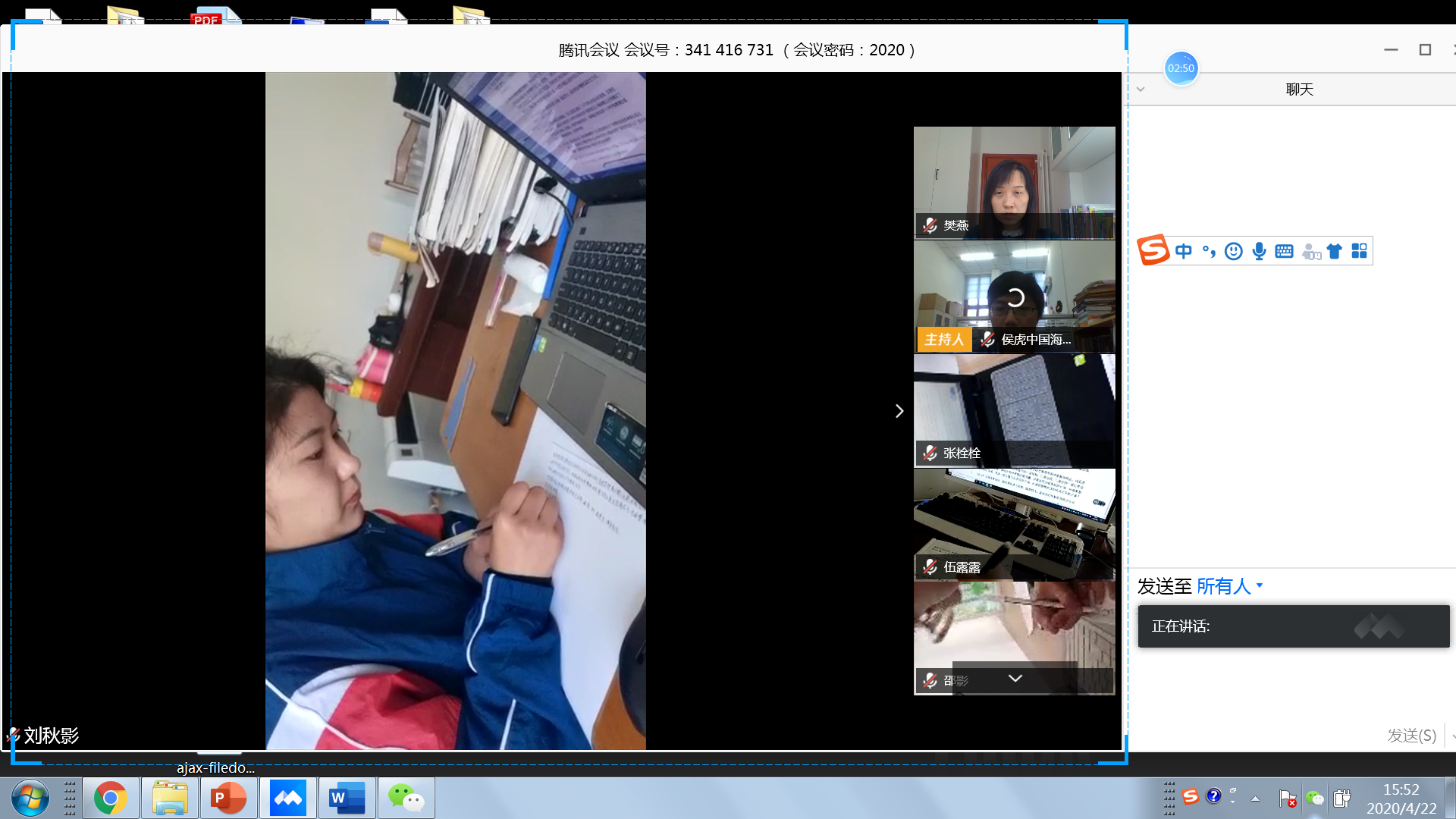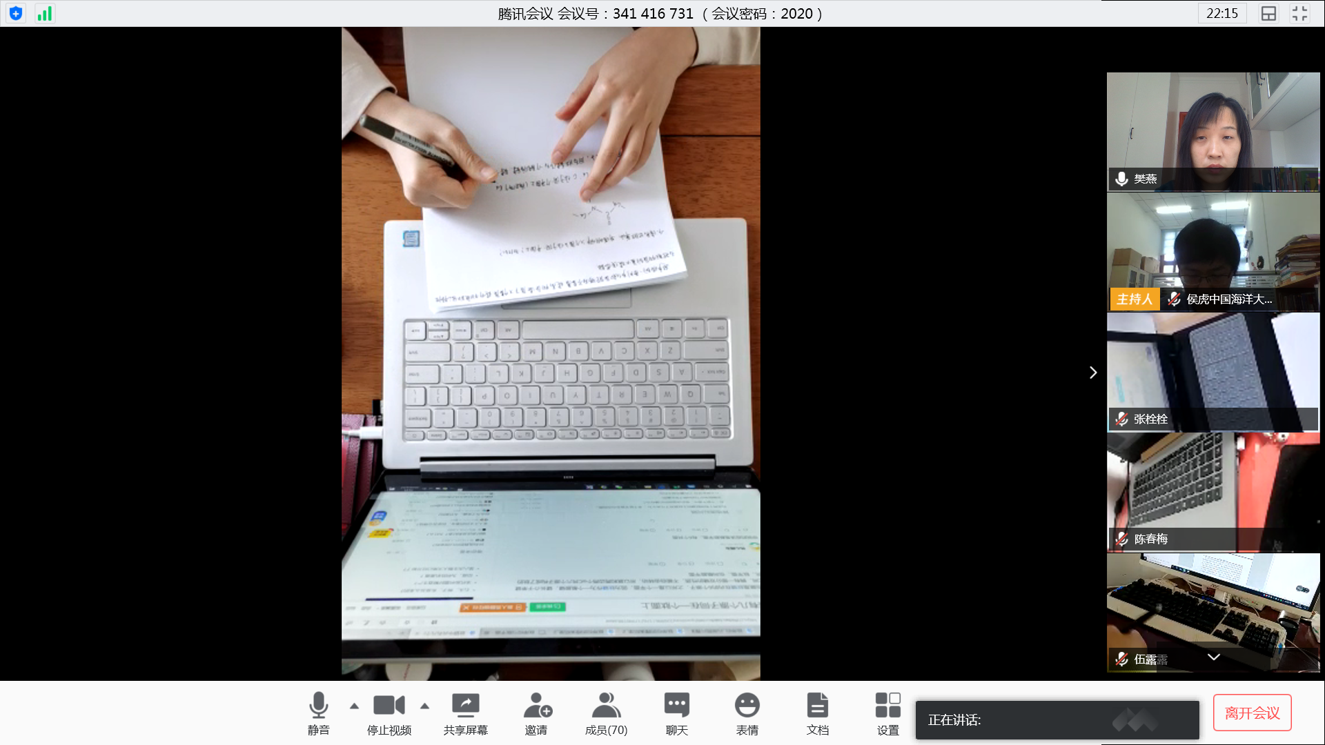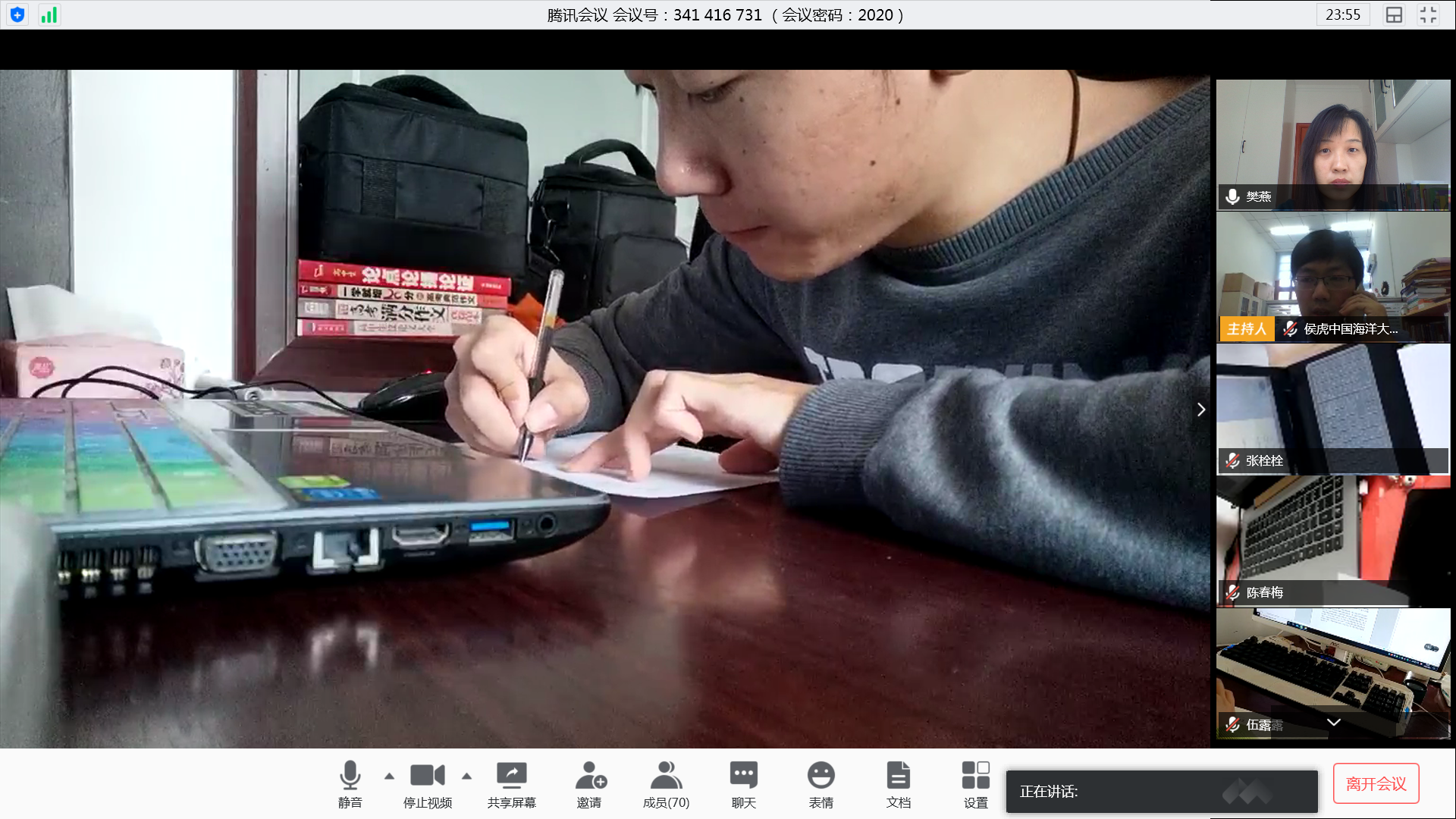 任课教师侯虎老师在Bb平台在线发布考试题目,学生在答题纸上书写答案并上传,监控教师樊燕、王彦超采用腾讯视频实时监控每个学生考试情况,针对学生考试情况随机放大学生图像进行监控,并通过语音实时调整学生监控画面,在线考试进展一切顺利。