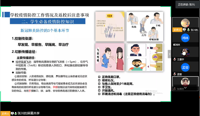 三位辅导员老师以“敬畏生命、爱国励志”为主题,从抗击新冠疫情,彰显中国精神、在抗‘疫’斗争中彰显青春的蓬勃力量、学校疫情防控工作情况及返校后注意事项、统筹好疫情防控和学习生活四个方面进行了详细的讲解。加强了爱国主义教育和思想政治引领,引导学生厚植家国情怀、增进爱国情感。同时,强调了学生在校期间的日常行为规范,引导学生明确校园封闭管理、正确佩戴口罩、保持手部卫生、保持“一米线”距离、不聚集等防疫健康要求。