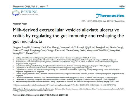 日前,贵妃直播 易华西教授团队与新加坡国立大学王炯伟教授团队合作,在生物医学1区杂志《Theranostics(2020 IF: 11.556)上发表题为“Milk-derived extracellular vesicles alleviate ulcerative colitis by regulating the gut immunity and reshaping the gut microbiota的研究论文。易华西教授和新加坡国立大学王炯伟教授为文章共同通讯作者,CSC联合培养博士研究生仝令君为文章第一作者,贵妃直播 为第一通讯单位。