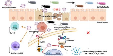 1 牛乳细胞外囊泡对IBD的缓解作用机制示意图