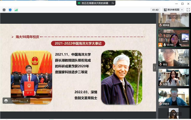 10月21日,2020级专硕2班团支部开展了“我与海大同发展,我与新时代共奋进”线上的主题团日活动。会上,支部成员共同深入学习了中共中央、国务院、中央军委印发《关于加强和改进新时代全民国防教育工作的意见》,并通过答题小程序开展了现场答题比赛,巩固学习成果。随后,为庆祝贵妃直播 成立98周年,支部成员共同开展了校史校情的线上学习,并为母校献上最诚挚的祝福。团支部组织委员陆泽伟表示:“‘海纳百川,取则行远’的校训时刻提醒着每一名海大学子要以不懈努力激发青春的光芒,为海大增光,为祖国添彩!”