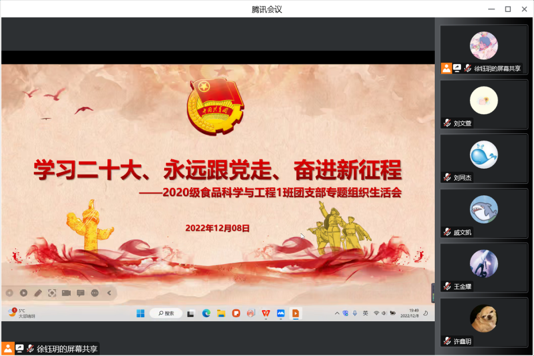 本站讯 为深入学习贯彻党的二十大精神,团结广大团员青年坚定不移听党话、跟党走,12月8日,2020级食品科学与工程1班团支部“学习二十大、永远跟党走、奋进新征程”专题组织生活会于线上腾讯会议召开,会议由团支部书记徐钰玥主持,班主任刘同杰、辅导员张川及班级全体同学参加会议。