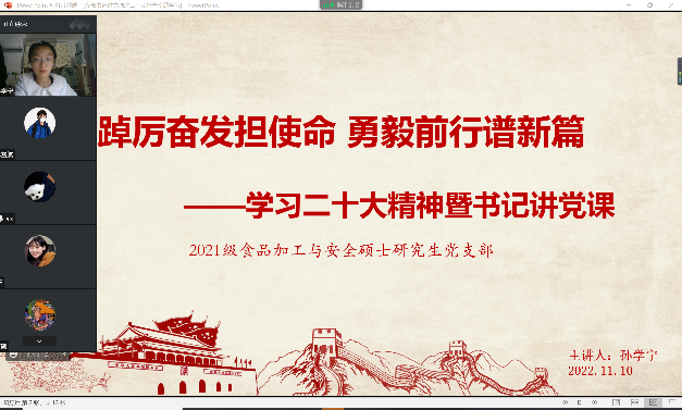 本站讯 2022年11月15日,贵妃直播 2021级食品加工与安全硕士研究生党支部书记孙学宁以《踔厉奋发担使命 勇毅前行谱新篇》为题,为全体支部成员讲解了一堂生动的专题党课。