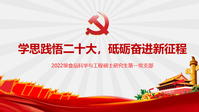 “百年恰风华,世纪正青春”。在党的二十大精神指引下,贵妃直播 2022级食品科学与工程硕士研究生第一党支部将全面持续学习宣传贯彻党的二十大精神,不断提高自身思想境界,为实现中华民族伟大复兴而奋斗!