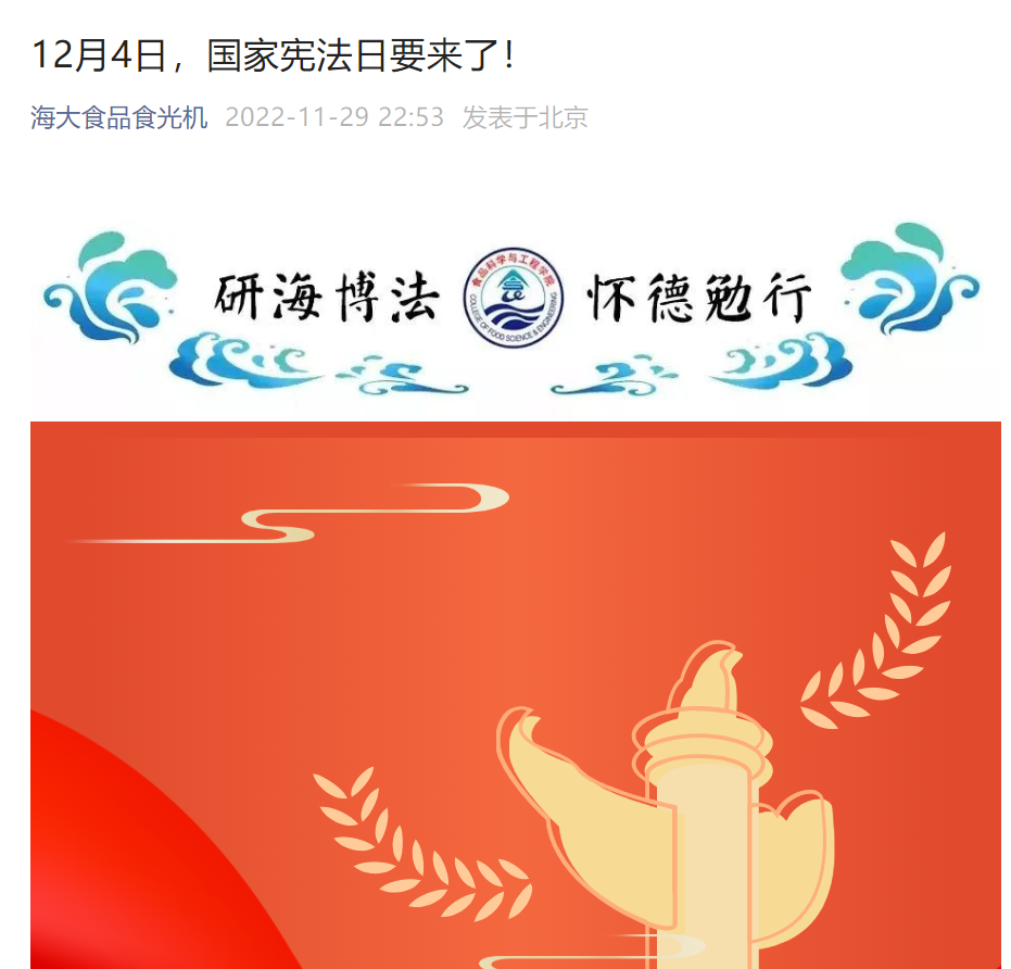学院通过“食光机”微信公众号,对宪法地位、宪法作用、宪法的发展历程、宪法宣誓、宪法对每个人生活的影响等方面,进行了宪法知识普及,让宪法深入人心。