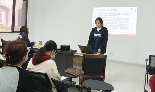首先,支部书记周倩就党的二十大对党章进行修改的必要性和基本考虑及中国共产党党章的建设的历程进行详细地讲解。着重强调了中国共产党百年的党章建设史,记录着我们党波澜壮阔的历史轨迹,展现着我们党成长、成熟、成功的艰辛历程,体现着马克思主义中国化时代化的伟大进程。在新时代新征程上,学习把握党章与时俱进的过程,能使全党更好地结合目前形势和任务自觉学习党章、遵守党章、贯彻党章、维护党章,充分发挥党章在全面建设社会主义现代化国家、全面推进中华民族伟大复兴中不可替代的作用。