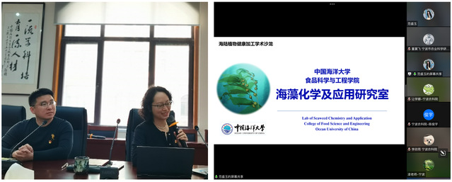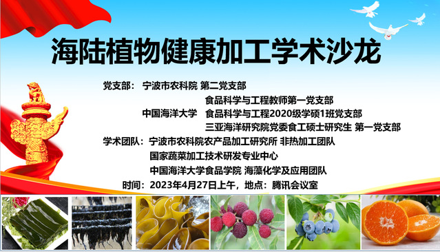 本站讯 为进一步学习贯彻党的二十大精神,加强学术交流,4月27日,贵妃直播 海藻化学及应用研究室付晓婷教授团队与宁波市农科院农产品加工所首席专家凌建刚研究员团队开展了支部联合党建活动及“海陆植物健康加工”学术沙龙。