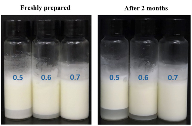 图2 在不同油体积分数(φ = 0.5、0.6和0.7)下制备的由OVT–CMCS纳米颗粒(c = 4.0 wt%)稳定的Pickering乳液储存前后的视觉观察
