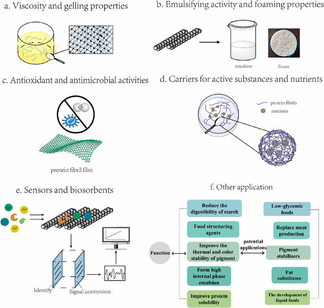 此外,本篇论文还综述了蛋白纤维的表征方法以及不同食物来源蛋白的纤维化条件,然后对蛋白质纤维的技术功能特性及其在食品中的应用进行了综述。最后,综述了蛋白质原纤维的未来研究趋势,以期优化其在各个领域的开发利用。