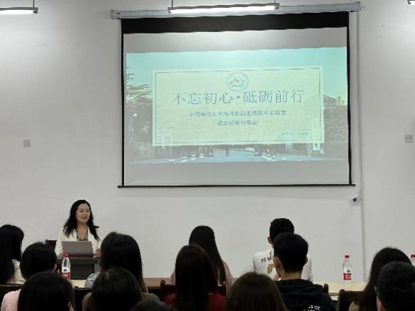 实验室2014级硕士张竞竞现任青岛滨海学院附属医院科教部主任,是青岛大学研究生合作导师,山东省老年医养康护一体化特色实验室带头人,青岛滨海学院肿瘤重大疾病靶向递药创新团队带头人。在本次活动中,她从科研、工作与生活三方面展开讲述,期望能为实验室师弟师妹们提供一些帮助。在青岛滨海学院就职期间,她曾多次带领学生参加创新创业比赛,并取得了一些瞩目的成果,她提出要不怕失败,去多经历,多参与,多尝试,这些经验以后都会成为大家宝贵的财富。她提到海洋食品生物技术实验室目前正处于高速发展状态,拥有丰厚的师资力量,大家有了更好的平台,能受到更好的锻炼,因此更应该把握机会,顺势而上。