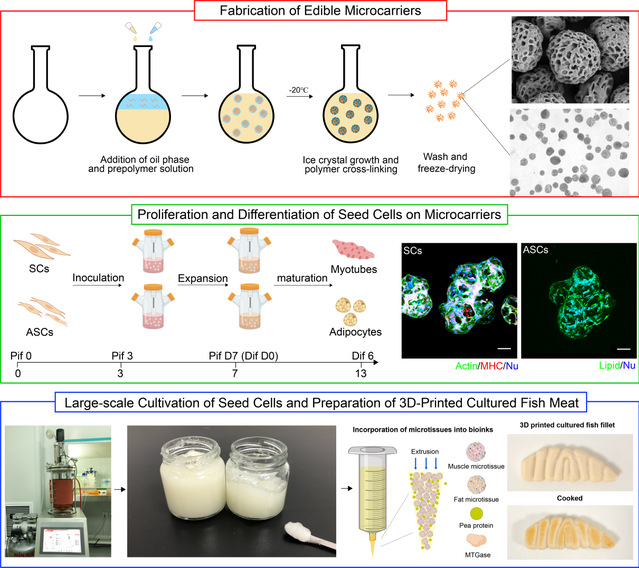图1. 可食性微载体构建、种子细胞程序化培养与3D打印培育鱼肉开发流程