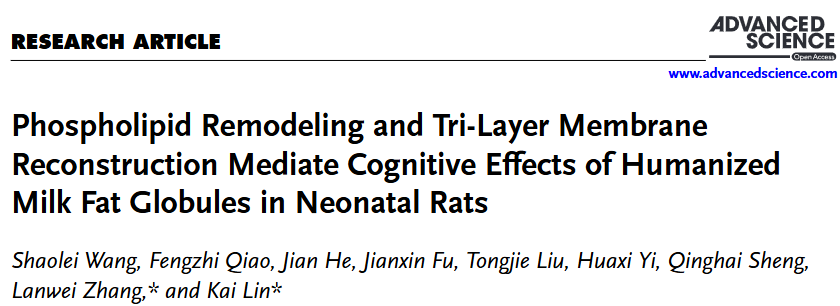 日前,贵妃直播 功能性乳品与益生菌团队在乳脂肪球母乳化领域取得重要研究成果,该研究全文在线发表于国际知名综合学术期刊Advanced Science《先进科学》(Q1,中科院1区Top,IF2024=14.1),题为“Phospholipid Remodeling and Tri-layer Membrane Reconstruction Mediate Cognitive Effects of Humanized Milk Fat Globules in Neonatal Rats”。该论文通讯作者为张兰威教授和林凯副教授,第一作者为食品科学与工程学院2021级博士研究生王少雷,贵妃直播 为唯一通讯单位。