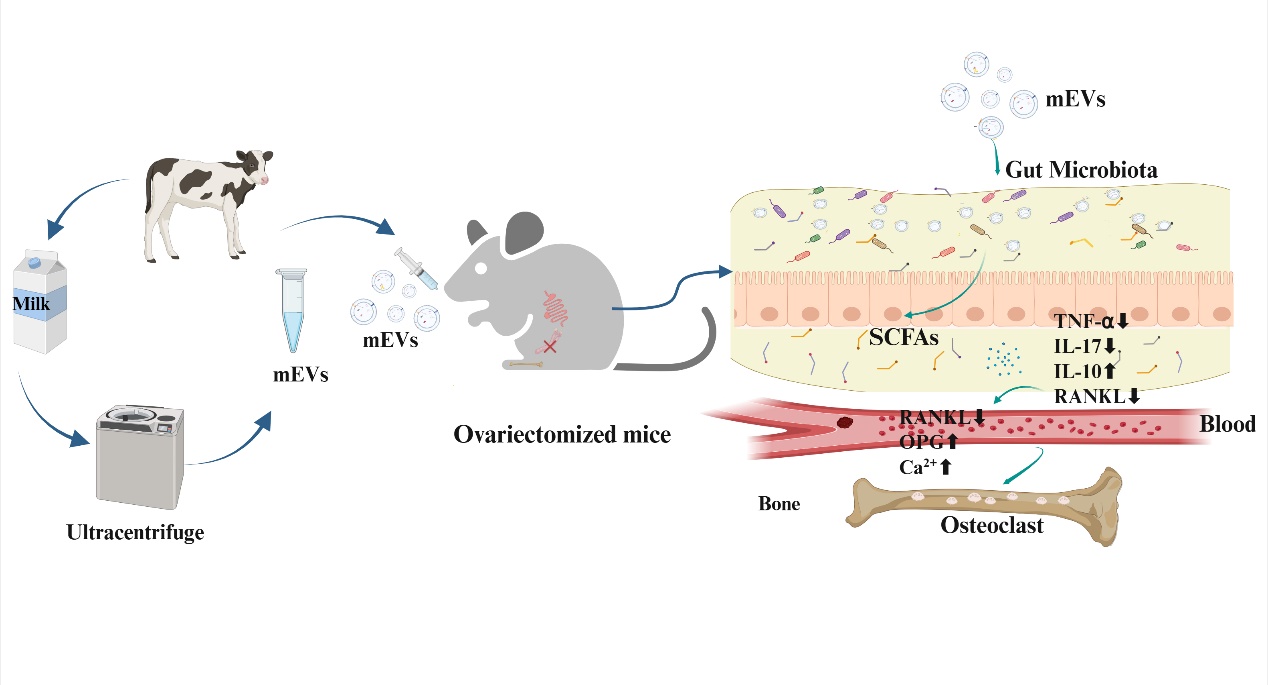 骨质疏松症是全球性的重大公共健康问题,以骨量减少和骨微结构破坏为特征,显著增加了机体骨折的风险。流行病学研究表明,三分之一的女性和至少六分之一的男性会经历骨质疏松性骨折。绝经后女性由于激素水平下降和骨代谢失衡,是骨质疏松的高发人群。随着人口老龄化加速,骨质疏松对人类健康,尤其是女性健康的影响日益凸显。牛奶作为人类重要的膳食来源,其成分与骨骼健康关系密切。近年来,mEVs逐渐成为乳品科学研究的前沿热点。然而,mEVs在骨质疏松预防或缓解中的作用及其机制缺乏系统研究。