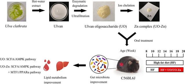 肥胖是21世纪全球性的重大健康挑战,其发病机制复杂,涉及遗传易感性、饮食及生活方式等多种因素。近年来,肠道微生物群在肥胖发生与发展中的作用备受关注,靶向肠道菌群的益生元干预策略显示出巨大潜力。研究表明,石莼低聚糖(Ulvan oligosaccharides, UO)因其良好的溶解性与生物可利用度,能更有效地被益生菌利用,促进有益菌(如产丁酸盐细菌)增殖,从而改善代谢健康。锌作为人体必需的微量元素,在肥胖个体中呈缺乏状态,与胰岛素抵抗、炎症等代谢并发症密切相关。然而,传统的锌补充剂存在生物利用度低、胃肠道刺激等问题。近年来,利用多糖或寡糖作为金属离子配体,开发新型高效微量元素补充剂已成为研究热点。