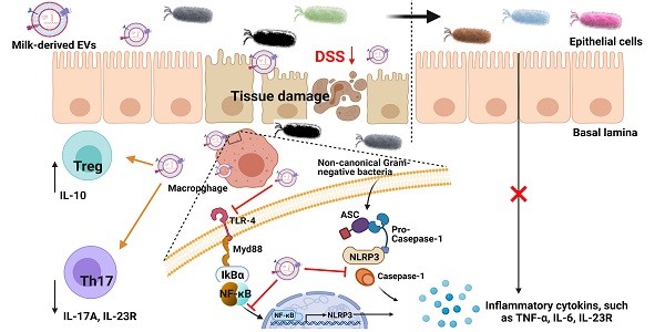 Lingjun Tong, Haining Hao, Zhe Zhang, Youyou Lv, Xi Liang, Qiqi Liu, Tongjie Liu, Pimin Gong, Lanwei Zhang, Fangfang Cao, Giorgia Pastorin, Chuen Neng Lee, Xiaoyuan Chen, Jiong-Wei Wang, Huaxi Yi. Milk-derived extracellular vesicles alleviate ulcerative colitis by regulating the gut immunity and reshaping the gut microbiota. Theranostics. 2021, 11, 8570-8586.